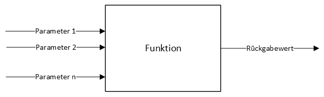 Funktionen können wir uns vorstellen als kleine Maschinen, welche eine "Eingabe" und eine "Ausgabe" haben. Sie nehmen Daten (Werte) über Parameter auf, verarbeiten sie, bzw. verändern sie und produzieren ein Ergebnis (Rückgabewert).