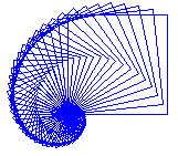 Das nebenstehende Bild entsteht, indem die Länge der Quadratseite ausgehend von 180 bei jedem nachfolgenden Quadrat um den Faktor \(0.95\) verkleinert wird. Es werden \(100\) Quadrate gezeichnet. Schreibe das Programm mit dem Befehl quadrat(s)